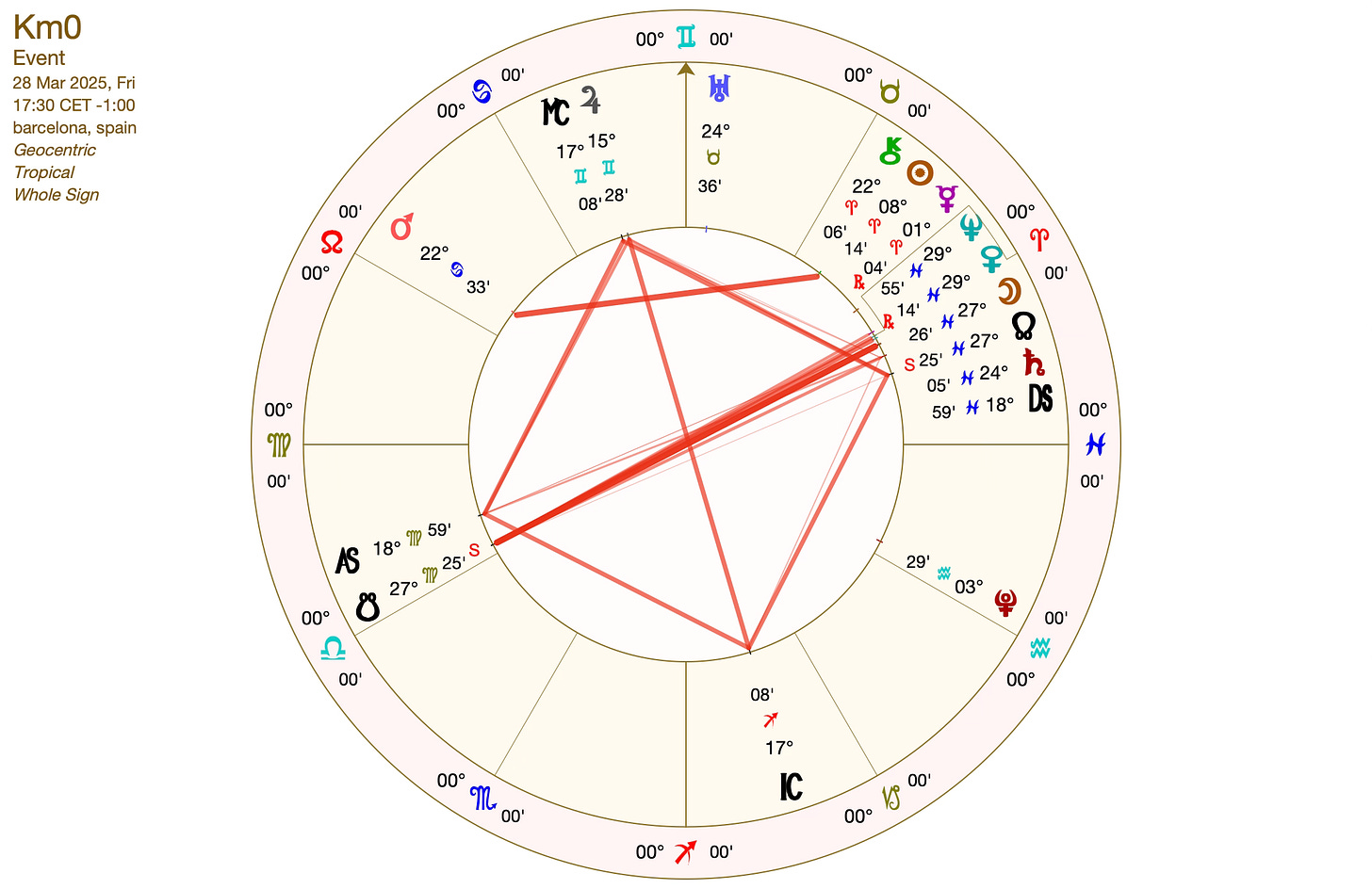 (*Para los amantes del Ciclo Sinódico de Venus, como yo, Km0 nació horas antes de que Venus amaneciera en Piscis como Estrella de Día en su Nuevo Ciclo Sinódico!! así que trae el potencial alquímo de la unión entre lo anterior y lo nuevo, Leo y Piscis…exactamente lo mismo que indica su Linaje Piscis/Aries! WOW).